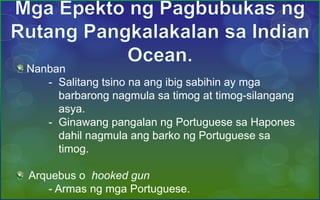 KULTURA AT RELIHIYON IKINALAT ANG KATOLI- SISMO PULITIKAEKONOMIYA O KALAKALAN GANAP NA MONOPOLYO ANG KALAKALAN SA. EPEKTO NG PANANAKOP NG MGA PORTUGUESE MGA NASAKOP SA ASYA Ternate sa Moluccas INDONESIA Hormuz sa Persian Gulf Goa sa India Cochin Macao sa China Malacca sa Malay MALAYSIA 13. Ito ay isang handout o learners module na katatagpuan ng aralin o paksa tungkol sa Mga Epekto ng Digmaang Pandaigdig sa Japan.