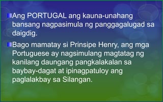Naipapahayag ang kahalagahan sa panggagalugad sa unang yugto ng kolonyalismo.