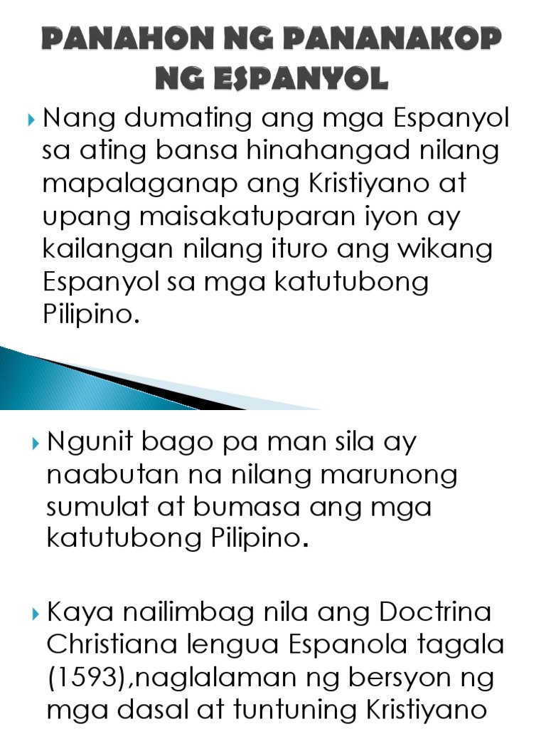 Opisyal na relihiyon noong panahon ngEspanyol5. Ang ating mga ninuno ay may sarili nang panitikan bago pa ang naging pananakop ng mga Espanyol sa bansa. Ang pananakop ng mga Kastila sa Pilipinas sa pamamahala ng Espaa na tumagal ng mahigit 333 taon ay may malaking kontribusyon sa Kultura ng Pilipinas.