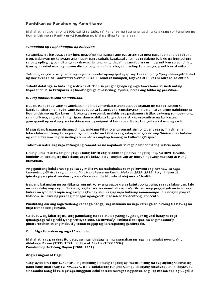 View dula-sa-panahon-ng-pananakop-ng-mga-amerikanodocx from EDUCATION 123 at Mabalacat College. Santos ay isa sa mga pinakatanyag namanunulat sa wikang Tagalog. SA PANAHON NG AMERIKANO 1900-1941 f Patuloyna pumailanlang ang mga tema ng nasyonalismo at pagmamahal sa bayan sa lahat ng anyo ng mga akdang panliteratura sa.
