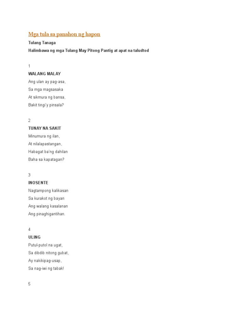 TULA Sa artikulong ito tatalakayin natin ang ibat ibang halimbawa ng mga tulang Pilipino. Na bubuhay ang mga Pilipino sa takot at ginagawag laruan at walang awang pagpatay ng mga Hapones at mga makalipi o mga Pilipinong makahapon 12152015 Duenas. Ang Guryon ay isinulat ni Ildefonso Santos.